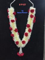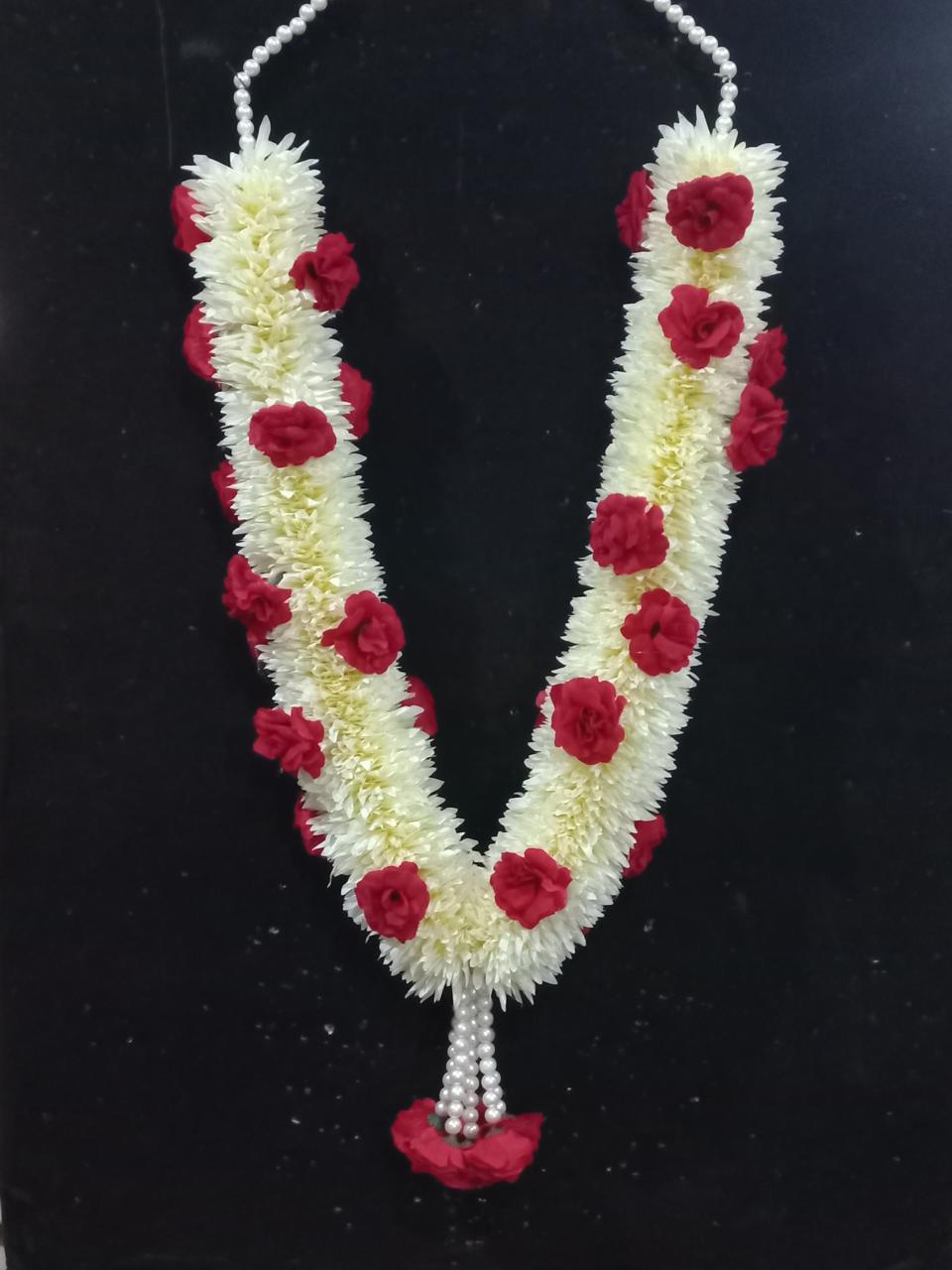 – Artificial Flowers Garlands Mala/Haar made with Polyester Fabric off-white & Red Colour.